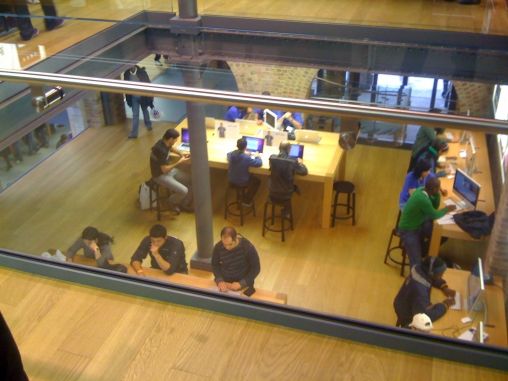 Martijn Verver (@tyno) was tijdens een trip zo aardig om even wat foto’s te maken van de nieuwste en grootste Apple Store. Covent Garden is de 300ste Apple Store die op 7 Augustus 2010 is geopend. Het lijkt op een bibliotheek, mooi maar anders dan je gewend bent van een Apple Store.