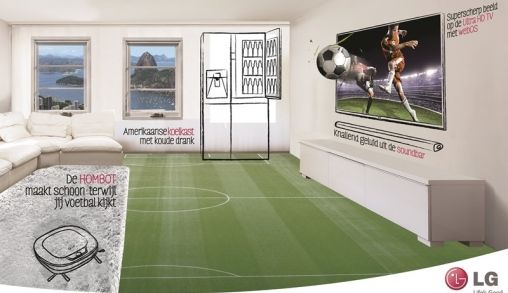 LG noemt het totaalvoetbal waarbij in de traditie van Brazilië je thuis de samba van het wereldkampioenschap kunt ervaren, alsof je erbij was! Bij totaalvoetbal hoort een totaalbeleving waarbij entertainment en huishoudelijke producten elkaar rugdekking geven. En heel eerlijk als je dit 4 weken lang om je heen hebt staan is dat WK wel vol te houden.